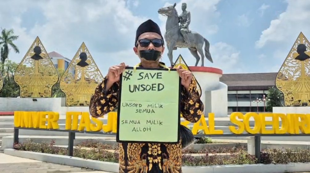 Sambil membawa poster bertuliskan “Save Unsoed, Unsoed Milik Semua, Semua Milik Alloh”, ia berdiri di depan area rektorat sebagai bentuk keprihatinan atas situasi yang dinilai tengah memasuki fase krisis kepercayaan.