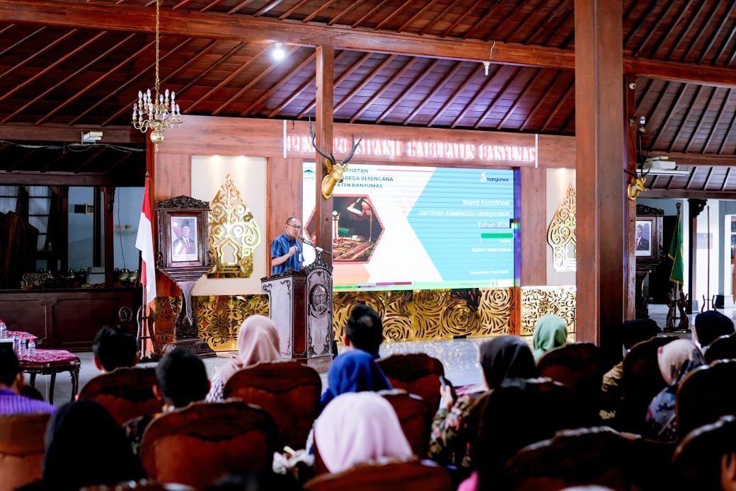 “Kondisi fiskal daerah saat ini cukup berat. Kami harus berupaya mencari berbagai sumber pendanaan, salah satunya untuk menjamin layanan kesehatan masyarakat,” tegasnya dalam Rapat Koordinasi Penyelenggaraan Jaminan Kesehatan Nasional (JKN) Tahun 2026 di Pendopo Si Panji, Purwokerto, Kamis (9/4/2026).