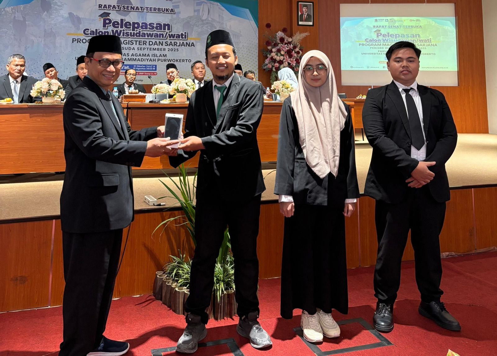 Di tengah suasana penuh kehangatan, momen istimewa terjadi. Perwakilan calon wisudawan dari ketiga prodi menyerahkan satu unit iPhone 15 kepada Dekan FAI UMP sebagai bentuk kenang-kenangan.