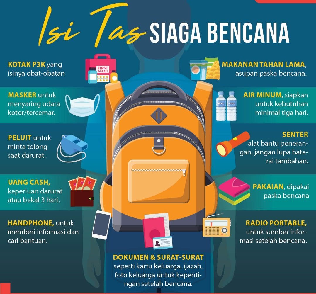 Dikutip dari Badan Nasional Penanggulangan bencana (BNPB), tas siaga bencana merupakan tas yang disiapkan untuk setiap anggota keluarga sebagai perlengkapan darurat saat bencana terjadi.