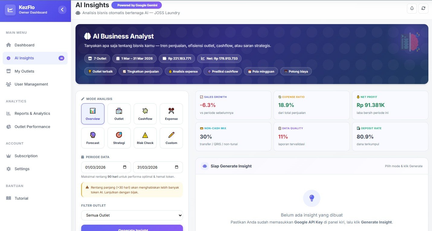 “Itulah alasan kami membangun Kezflo.com. Kami ingin mengubah kebiasaan ‘informal’ menjadi sesuatu yang ‘insightful.’ Hari ini, saya sangat antusias untuk mengumumkan bahwa Kezflo.com resmi merilis fitur AI Business Analyst. Ini bukan sekadar update teknis, tapi lompatan besar bagi ekosistem SME di Indonesia,” ujar Trias.