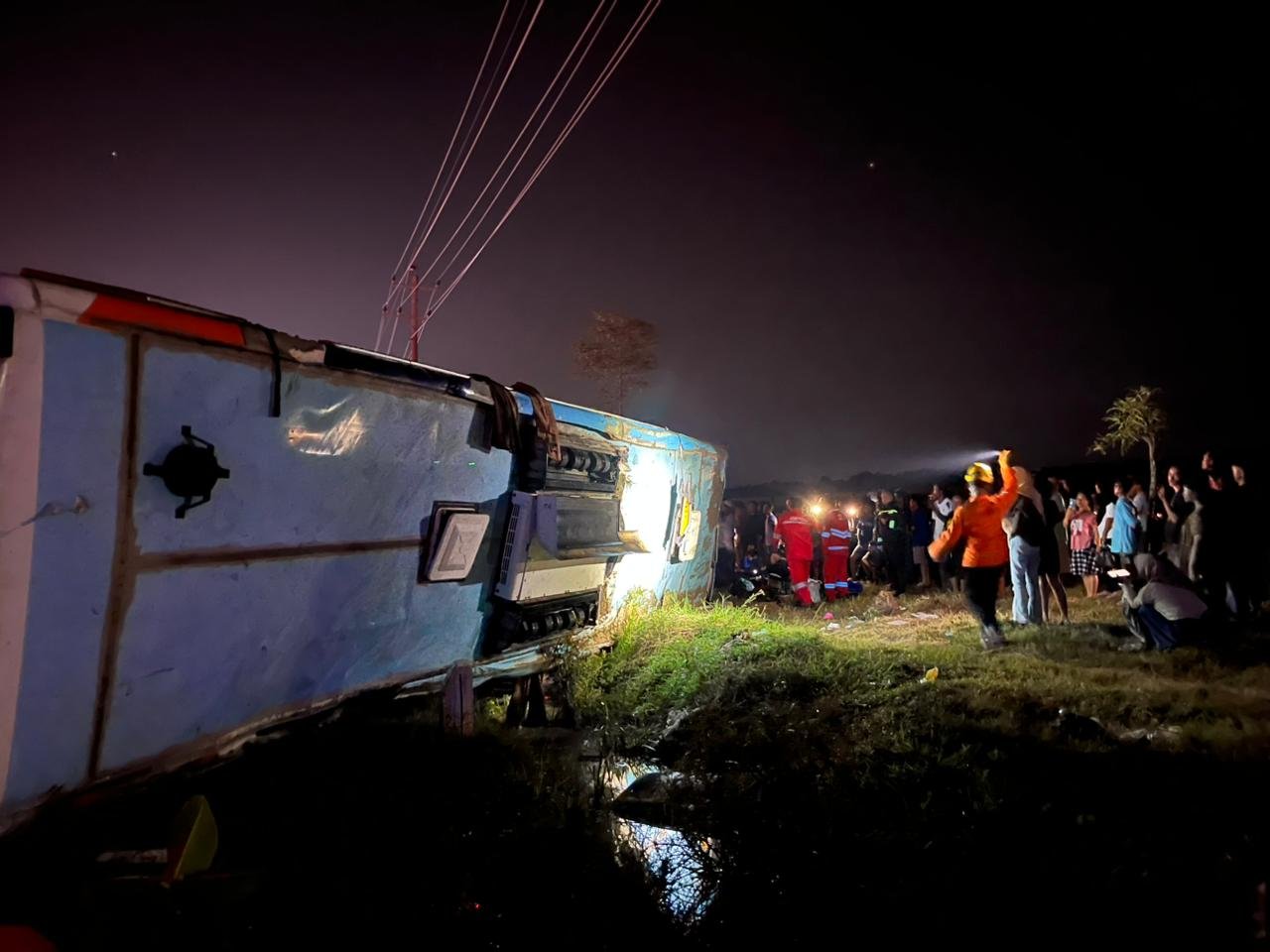 Bus Terguling di Tol Pejagan KM 259, 1 Orang Meninggal. Foto: Basarnas